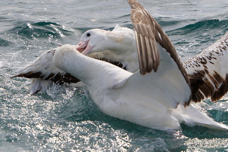 Location: South Pacific Ocean off Kaikoura Peninsula, Kaikoura District, Canterbury, New Zealand| Description: Gibson's race, D. e. gibsoni, probably squabbling over food. After fledging, it takes 10-15 years for this species to acquire definitive (adult) plumage. These birds are both near the upper end of that range. |