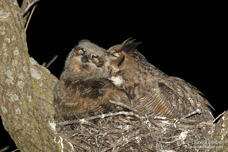 Location: Overland Park, Kansas, USA| Description: This nest was occupied in previous years by a pair of Red-tailed Hawks. Located high in a tree on the grounds of a retirement community, it is highly visible and has generated a lot of interest among the residents. The single chick is nearly grown, and the adults generally spend little time at the nest during the day, but this parent (the female?) returned without food on a brisk night and sat with the chick for half an hour or more. Allopreening (mutual preening) is relatively common among owls, but the term is usually applied to interactions between two adults or siblings rather than an adult preening a chick, as here. In nonscientific terms this looks for all the world like nuzzling or a bit of TLC. |